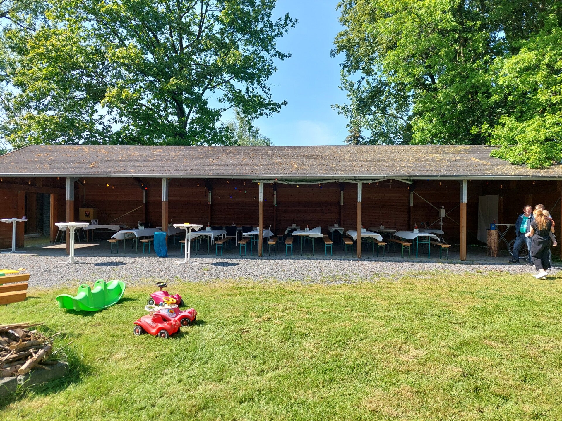 Die Grillhütte kann für kleine Gesellschaften oder zur Essensausgabe perfekt genutzt werden und die große überdachte Halle, bietet bequem Platz für über 100 Personen. Egal ob an heißen oder regnerischen Tagen, hier lässt es sich hier bestens feiern.
